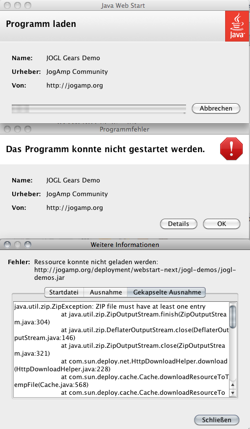 Created attachment 229 [details] Screenshot of the error dialogs that pop up when starting Gears.jnlp. Starting the gears demo via http://jogamp.org/deployment/webstart-next/jogl-demos/Gears.jnlp on Mac OS X Version 10.6.6 with all updates installed yields the following error: Exception: com.sun.deploy.net.FailedDownloadException: Ressource konnte nicht geladen werden: http://jogamp.org/deployment/webstart-next/jogl-demos/jogl-demos.jar at com.sun.deploy.net.DownloadEngine.actionDownload(DownloadEngine.java:1372) at com.sun.deploy.net.DownloadEngine.getCacheEntry(DownloadEngine.java:1525) at com.sun.deploy.net.DownloadEngine.getCacheEntry(DownloadEngine.java:1503) at com.sun.deploy.net.DownloadEngine.getResourceCacheEntry(DownloadEngine.java:1609) at com.sun.deploy.net.DownloadEngine.getResourceCacheEntry(DownloadEngine.java:1534) at com.sun.deploy.net.DownloadEngine.getResource(DownloadEngine.java:217) at com.sun.javaws.LaunchDownload$DownloadTask.call(LaunchDownload.java:1979) at java.util.concurrent.FutureTask$Sync.innerRun(FutureTask.java:303) at java.util.concurrent.FutureTask.run(FutureTask.java:138) at java.util.concurrent.ThreadPoolExecutor$Worker.runTask(ThreadPoolExecutor.java:886) at java.util.concurrent.ThreadPoolExecutor$Worker.run(ThreadPoolExecutor.java:908) at java.lang.Thread.run(Thread.java:680) Cause: java.util.zip.ZipException: ZIP file must have at least one entry at java.util.zip.ZipOutputStream.finish(ZipOutputStream.java:304) at java.util.zip.DeflaterOutputStream.close(DeflaterOutputStream.java:146) at java.util.zip.ZipOutputStream.close(ZipOutputStream.java:321) at com.sun.deploy.net.HttpDownloadHelper.download(HttpDownloadHelper.java:228) at com.sun.deploy.cache.Cache.downloadResourceToTempFile(Cache.java:568) at com.sun.deploy.cache.Cache.downloadResourceToCache(Cache.java:529) at com.sun.deploy.net.DownloadEngine.actionDownload(DownloadEngine.java:1347) at com.sun.deploy.net.DownloadEngine.getCacheEntry(DownloadEngine.java:1525) at com.sun.deploy.net.DownloadEngine.getCacheEntry(DownloadEngine.java:1503) at com.sun.deploy.net.DownloadEngine.getResourceCacheEntry(DownloadEngine.java:1609) at com.sun.deploy.net.DownloadEngine.getResourceCacheEntry(DownloadEngine.java:1534) at com.sun.deploy.net.DownloadEngine.getResource(DownloadEngine.java:217) at com.sun.javaws.LaunchDownload$DownloadTask.call(LaunchDownload.java:1979) at java.util.concurrent.FutureTask$Sync.innerRun(FutureTask.java:303) at java.util.concurrent.FutureTask.run(FutureTask.java:138) at java.util.concurrent.ThreadPoolExecutor$Worker.runTask(ThreadPoolExecutor.java:886) at java.util.concurrent.ThreadPoolExecutor$Worker.run(ThreadPoolExecutor.java:908) at java.lang.Thread.run(Thread.java:680)