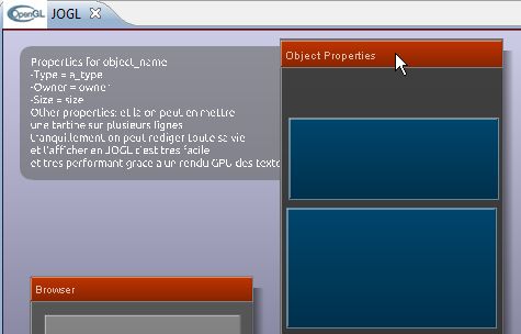 Created attachment 306 [details] screenshot of my demo of the ui graph package Hello, I propose this request for enhancement because I understand that you will work on the graph package before the final JOGL2 release and maybe you plan to work also on the ui part. In my case, I used to think about that during few days and I started a new package on my own based on what you've done in the com.jogamp.opengl.test.junit.graph.demos.ui package. I played a little bit with that, by defining UI classes based on UIShape to try to achieve something that fits my needs. The main issues I had to resolve were about modelview transformations and user interaction with UI elements. I implemented some kind of panel of RIButton and Label, each button+label can be positionned on screen independently and I implemented mouse hover and mouse click behaviors. What I would be pleased to have but it needs more technical work (on the shader part I guess) is more options for the rendering of UI elements: shadow and border options would be welcome :-) I attach a screenshot of my JOGL graph based UI. If you want to have a look at how I implemented RIButton and Panel I can send you my java code package... BTW, about the GPU based rendering of text, it seems that it will work well only for specific kind of needs. For large UI wich needs to scale well on different devices it will be perfect. But for more precise or fine UI with a lot of widgets, the text rendering isn't readable anymore for small size font (under 12 with the Ubuntu font). See on my second screenshot where I compare with a UI that use the AWT based TextRenderer. Thank you for sharing your thought about UI in JOGL with me and thank you for all your great work on JOGL :) I wish you great christmas and new year parties. Sebastien.
