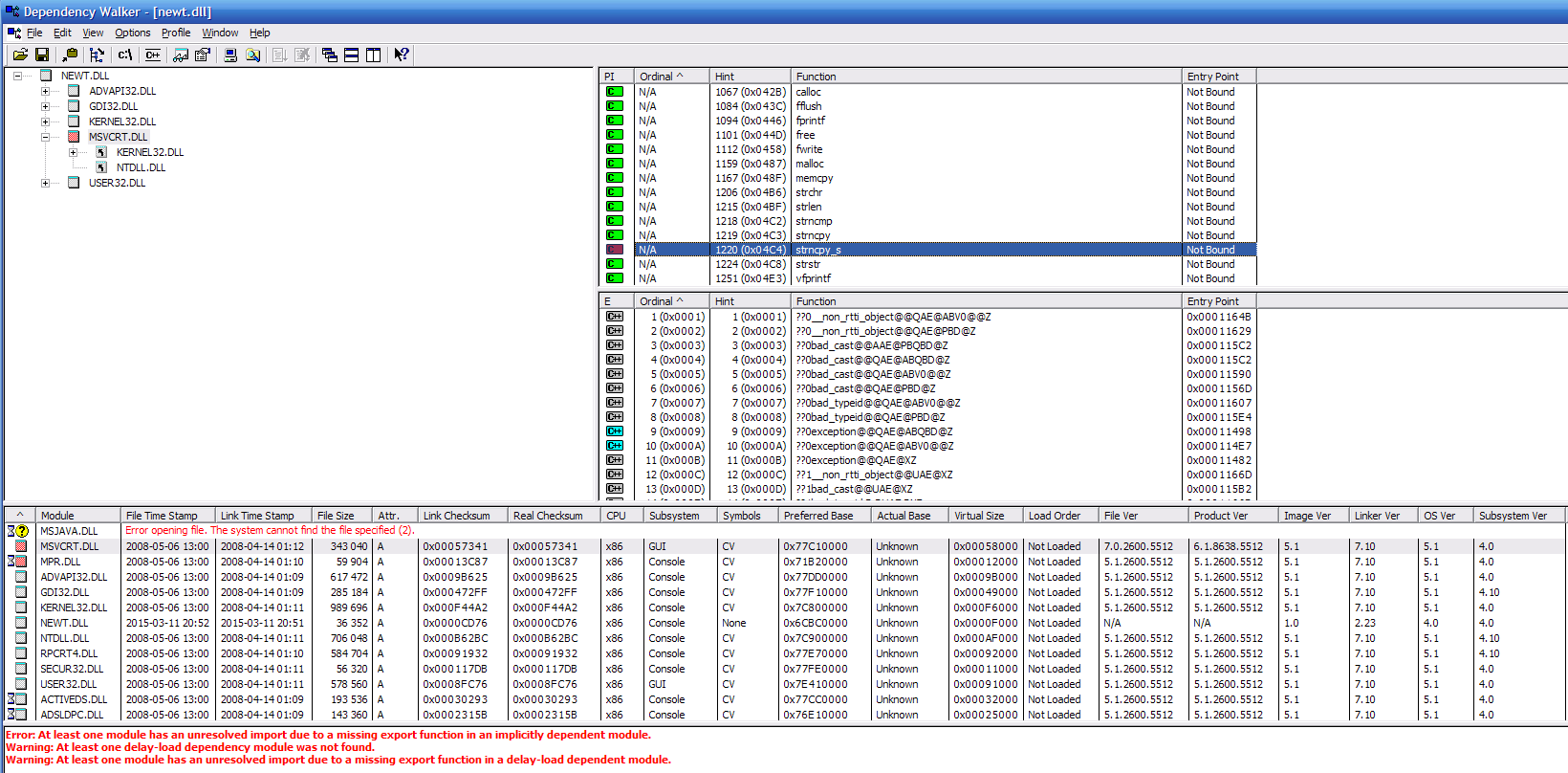 Created attachment 722 [details] dependencywalker-newt.dll-2.2.4.png running dependencywalker on the newt.dll from 2.2.4 manages to resolve all functions used from MSVCRT.DLL