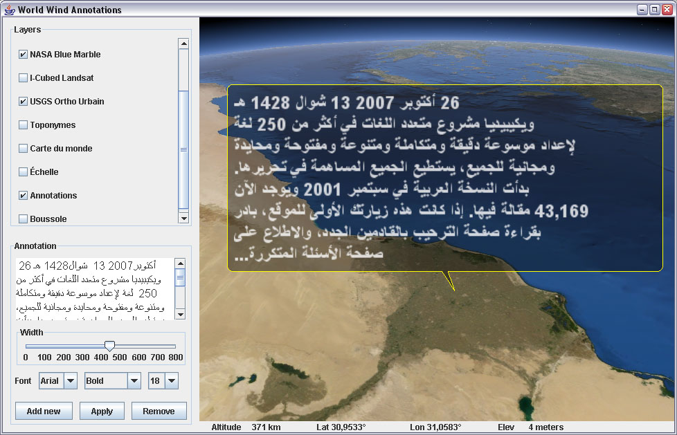 ---- Reported by kbr 2007-10-29 11:12:16 ---- Patrick Murris from the NASA World Wind Java project has indicated some potential issues with bi-directional text and the TextRenderer: """ I keep throwing foreign text from Wikipedia into the text renderer, and i'm still wondering exactly what the application should handle and what does the text renderer takes care of. I must admit i am not very familiar with the subject of ltr vs rtl text direction and such... not mentioning top to bottom. Still, looking at some arabic text - and looking hard to follow the glyphs... i can tell there are some ltr-rtl fighting in there - see screenshot (and look at both the textbox on the left and the main text display over the globe). My current Locale is french... i'm using arial, and i didnt try to switch locales for text rendering either. I can fairly imagine the application would have to handle (or know) whether the text direction should be ltr or rtl and decide the text left/right edge location accordingly. Then the text renderer should draw from the given x,y in the proper direction. Is that the way it is supposed to work ? If yes, then how does the application knows the proper text direction for a given text string ? """ The attached screen shot is an example. I am not sure there is an issue here. The Swing JTextArea requires a ComponentOrientation to get its text to render in the correct direction. The JOGL TextRenderer should handle, and appears to be handling, combined right-to-left and left-to-right glyphs on the same line correctly. ---- Additional Comments From kbr 2007-10-29 11:12:55 ---- Created an attachment Screen shot showing difference between JTextArea and TextRenderer ---- Additional Comments From kbr 2008-03-30 16:47:51 ---- At this point I don't think there is a bug in the JOGL TextRenderer. Closing as "invalid". Reopen this bug or file a new one if there is a concrete issue with a test case. --- Bug imported by sgothel@jausoft.com 2010-03-24 07:51 EDT --- This bug was previously known as _bug_ 329 at https://jogl.dev.java.net/bugs/show_bug.cgi?id=329 Imported an attachment (id=110) The original submitter of attachment 110 [details] is unknown. Reassigning to the person who moved it here: sgothel@jausoft.com.