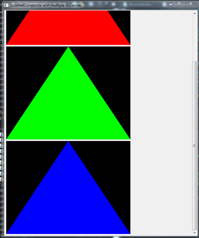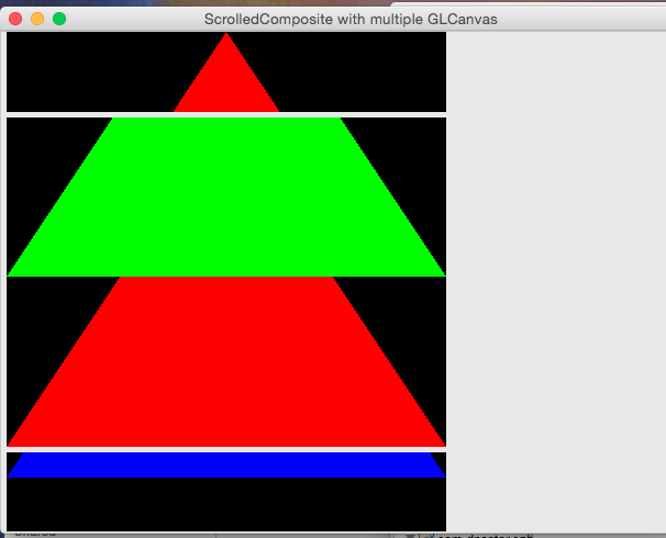 Created attachment 776 [details] ScrolledComposite issues with multiple GLCanvas. The ScrollingMultiPane class demonstrates a broken behavior between jogamp 2.3.2 com.jogamp.opengl.swt.GLCanvas and SWT ScrolledComposite. On Win7 this displays as three different color triangles each in 300x400 panes that can be vertically scrolled. In MacOSX 10.10.3, the 3 views conflict with each other and display incorrectly when scrolled.