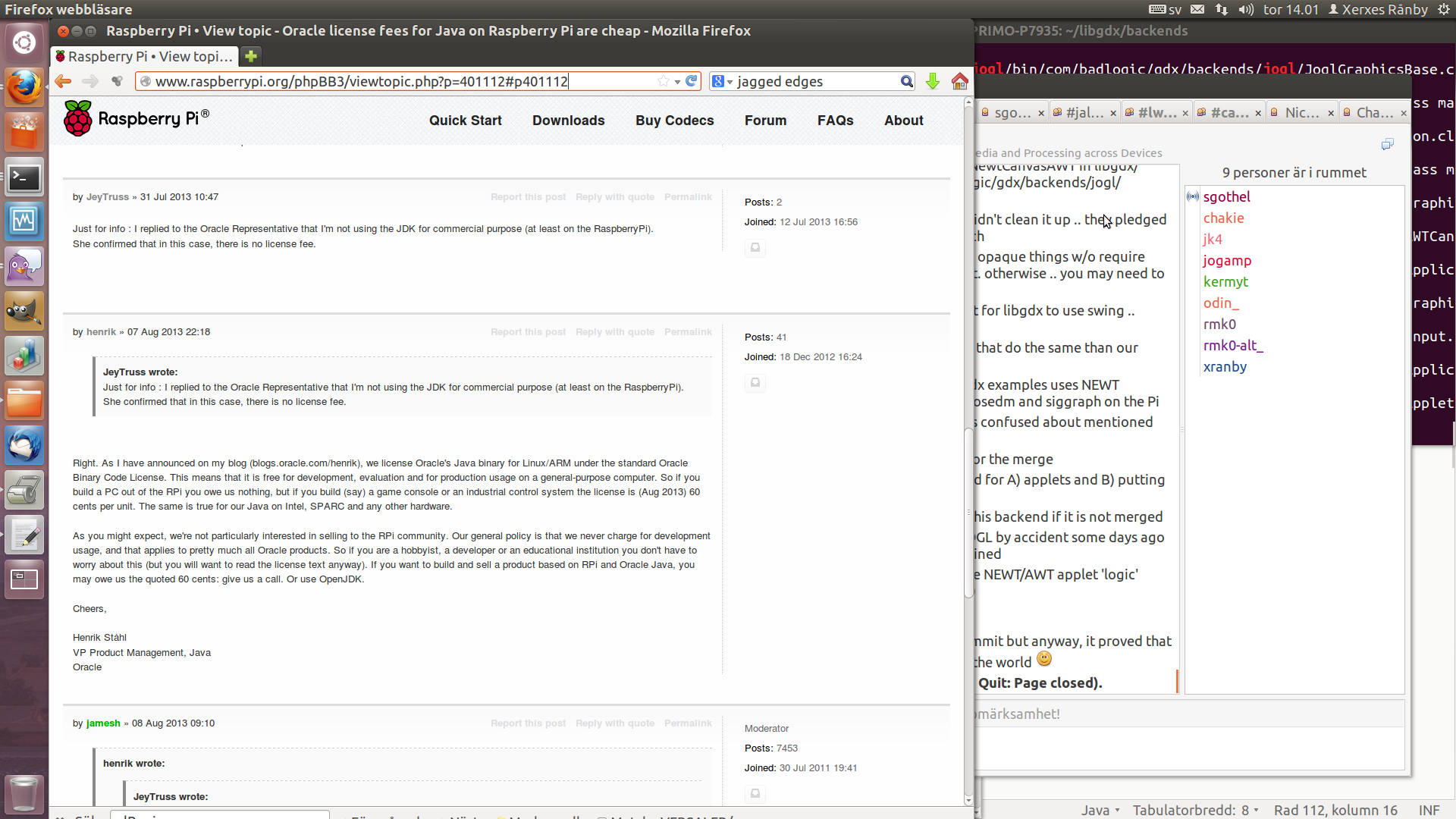 Created attachment 493 [details] Screenshot of Raspberry Pi forum: http://www.raspberrypi.org/phpBB3/viewtopic.php?p=401112#p401112 png Henrik made a legal statement inside the Raspberry Pi forum stating that OpenJDK do not require a license for non PC use: by henrik » 07 Aug 2013 22:18 http://www.raspberrypi.org/phpBB3/viewtopic.php?p=401112#p401112 - Oracle license fees for Java on Raspberry Pi are cheap Attached screen-shot of the forum thread including the text below: +++ Right. As I have announced on my blog (blogs.oracle.com/henrik), we license Oracle's Java binary for Linux/ARM under the standard Oracle Binary Code License. This means that it is free for development, evaluation and for production usage on a general-purpose computer. So if you build a PC out of the RPi you owe us nothing, but if you build (say) a game console or an industrial control system the license is (Aug 2013) 60 cents per unit. The same is true for our Java on Intel, SPARC and any other hardware. As you might expect, we're not particularly interested in selling to the RPi community. Our general policy is that we never charge for development usage, and that applies to pretty much all Oracle products. So if you are a hobbyist, a developer or an educational institution you don't have to worry about this (but you will want to read the license text anyway). If you want to build and sell a product based on RPi and Oracle Java, you may owe us the quoted 60 cents: give us a call. Or use OpenJDK. Cheers, Henrik Ståhl VP Product Management, Java Oracle +++